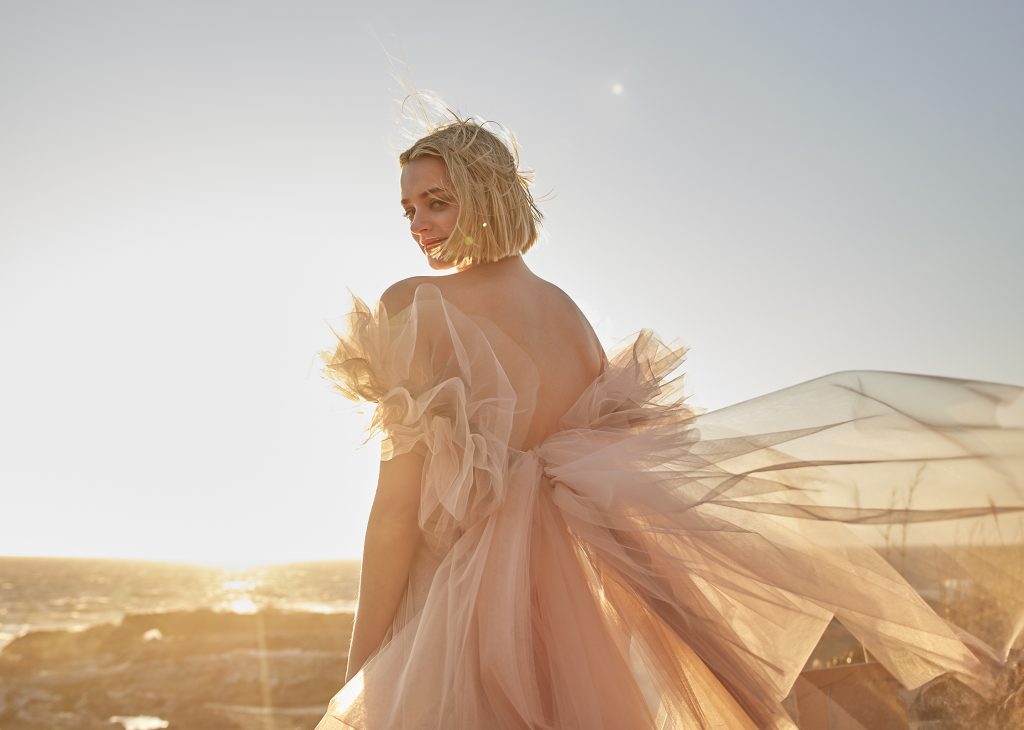 デコルテのボリュームのあるチュールはお取り外しも可能でございます♩
